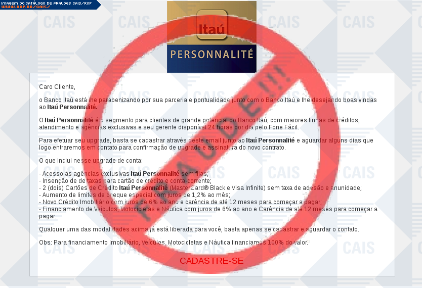 | comentário | A vítima recebe uma mensagem informando que sua conta no banco Itaú solicitando cadastro para participação do Itaú Personalité no link disponibilizado, no entanto a página é falsa destinada a roubar as informações bancárias do usuário. | |
