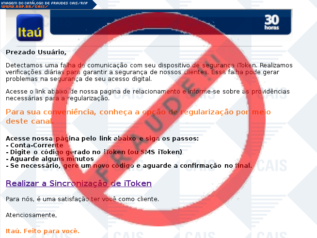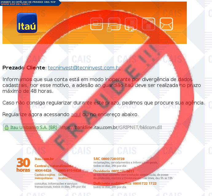 | assunto | Prezado(a) phishing@cais.rnp.br , Aviso :Suporte Itaú. | |
