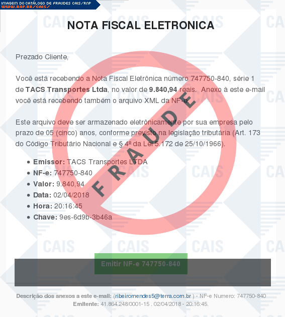 Esta página tem função informativa e educativa. Exibe uma coleção de imagens de phishing scam (fraudes eletrônicas) ou malware (código malicioso) veiculados por meio de spam (e-mail não-solicitado). Trata-se de conteúdo exemplificativo, não exaustivo, uma vez que não é possível contemplar todos os casos de fraudes existentes. Assim, caso você tenha conhecimento de um exemplar que não esteja aqui presente, isto não significa que não seja válido ou real. Inclusive incentivamos que você o envie para análise do CAIS para que, se for o caso, passe a integrar o nosso acervo.