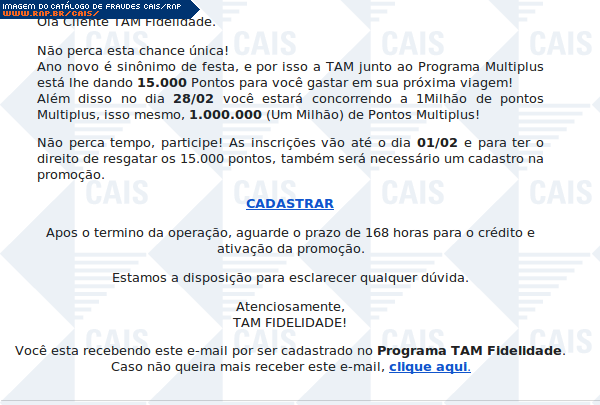 | comentário | Fraude se passa por promoção da Tam e promete creditar 15.000 Milhas na conta da vítima após cadastro. Porém o link destinao ao cadastro apontava para uma página inexistente. | |