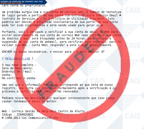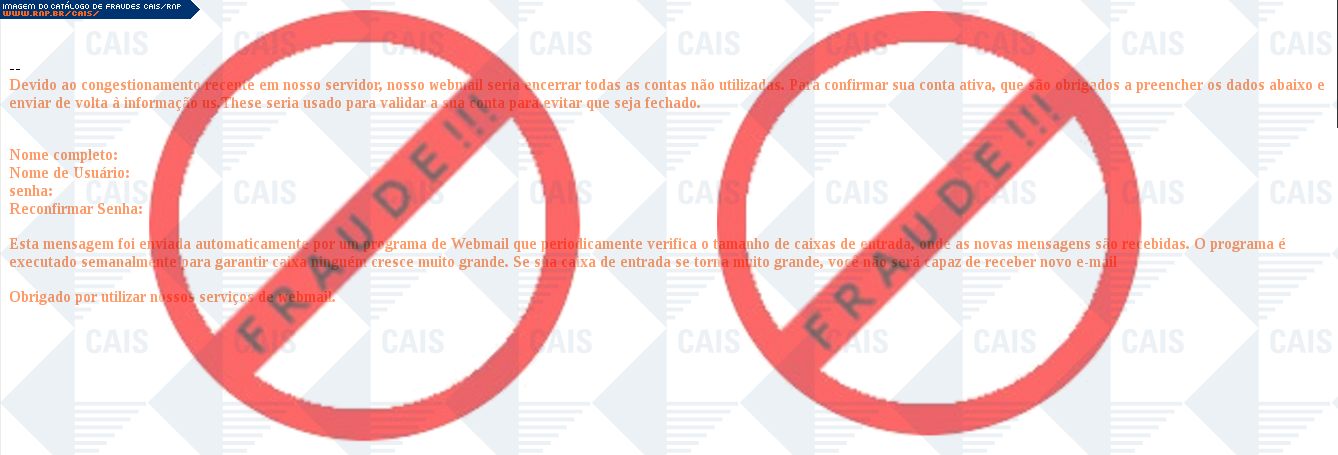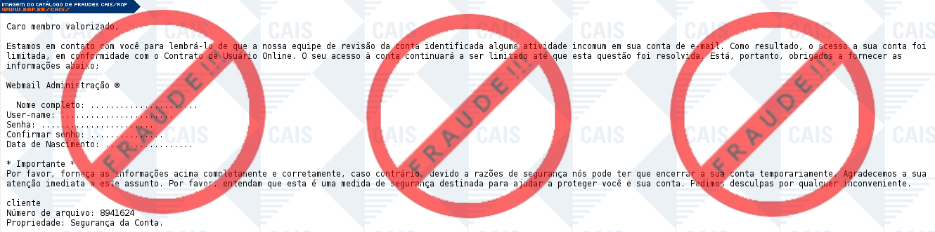 | comentário | A fraude consiste em uma mensagem informando de um suposto excedente de cota de email. É pedido que a vítima responda ao email informando suas credenciais de acesso. | |