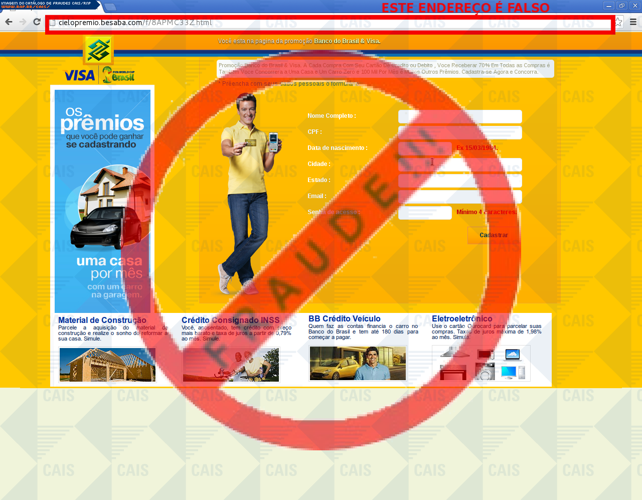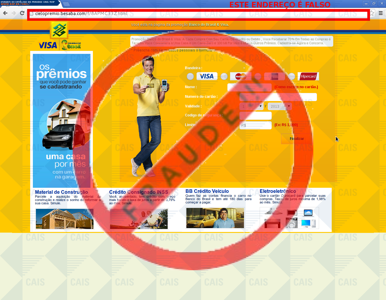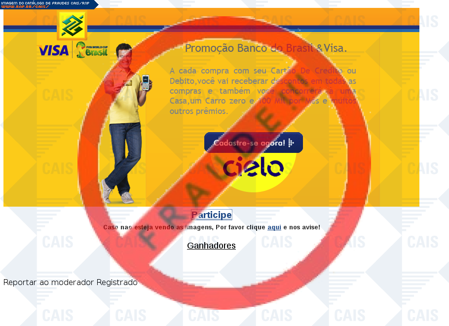 | comentário | A fraude consiste em um email pedindo à vítima para se cadastrar em uma promoção de uma administradora de cartão de crédito. O link para a suposta promoção redireciona para um site de phishing. | |
