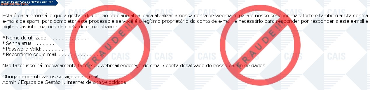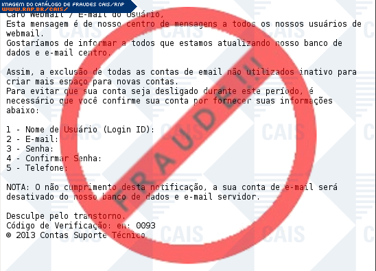 | comentário | A fraude consiste em uma mensagem pedindo que a vítima reponda informando suas credenciais de acesso à conta de email. A finalidade seria uma suposta atualização na base de dados. | |