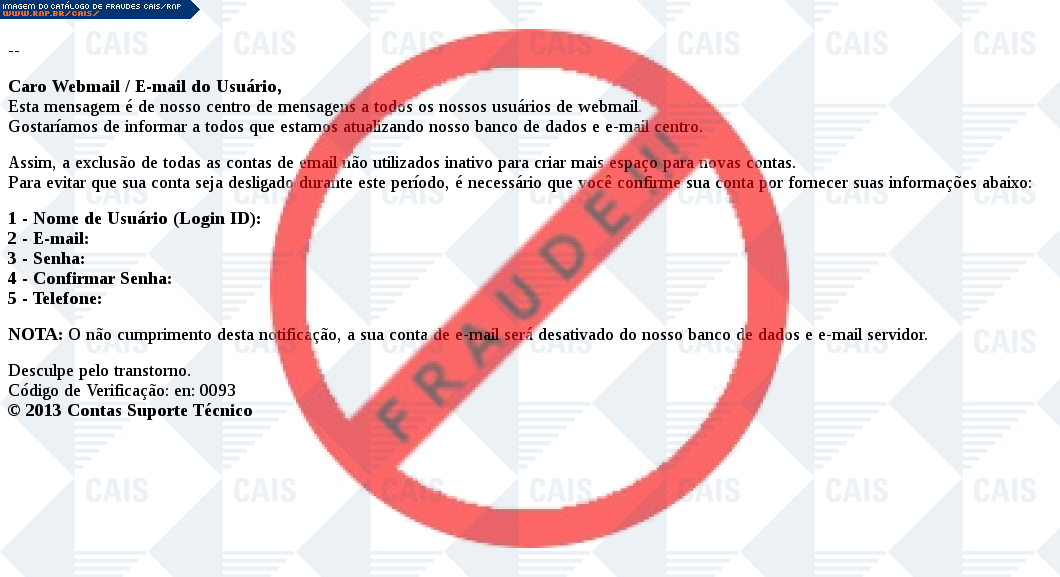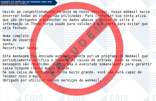 | comentário | A vítima recebe uma mensagem informando da necessidade de atualizar sua conta de email. É pedido que a vítima responda à mensagem informando suas credenciais de acesso. | |