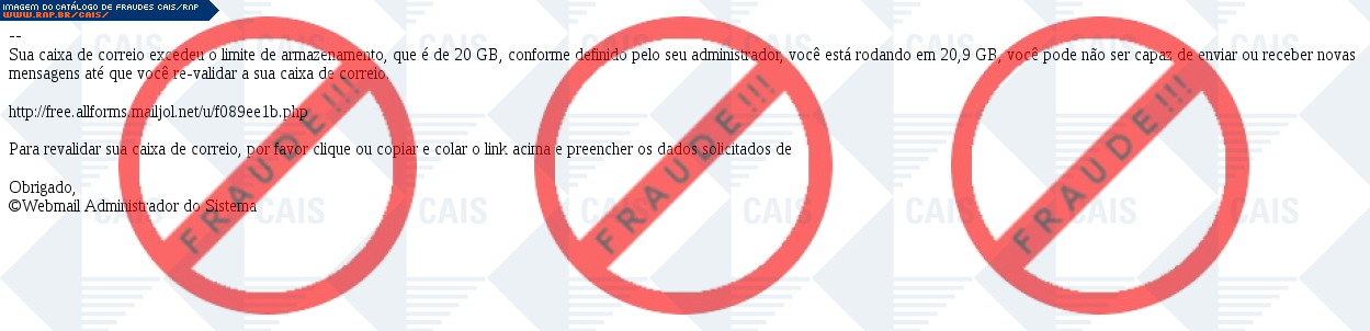 | comentário | A fraude consiste em uma mensagem informando a vítima de um suposto excedente na quota de email. Para sanar o suposto problema é fornecido um link que redireciona para um site de phishing. | |