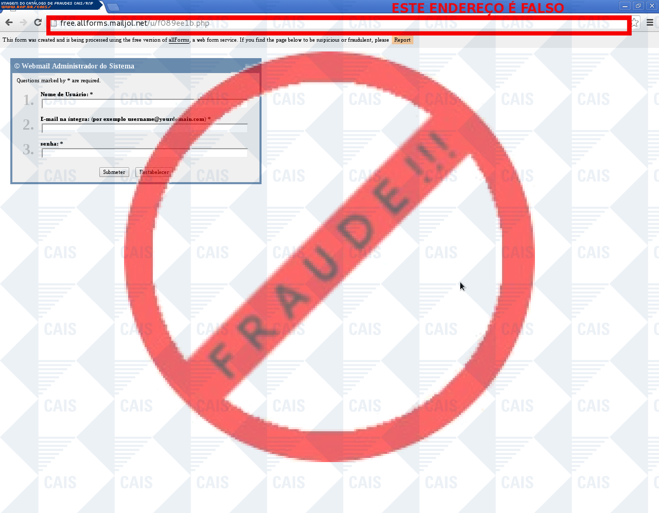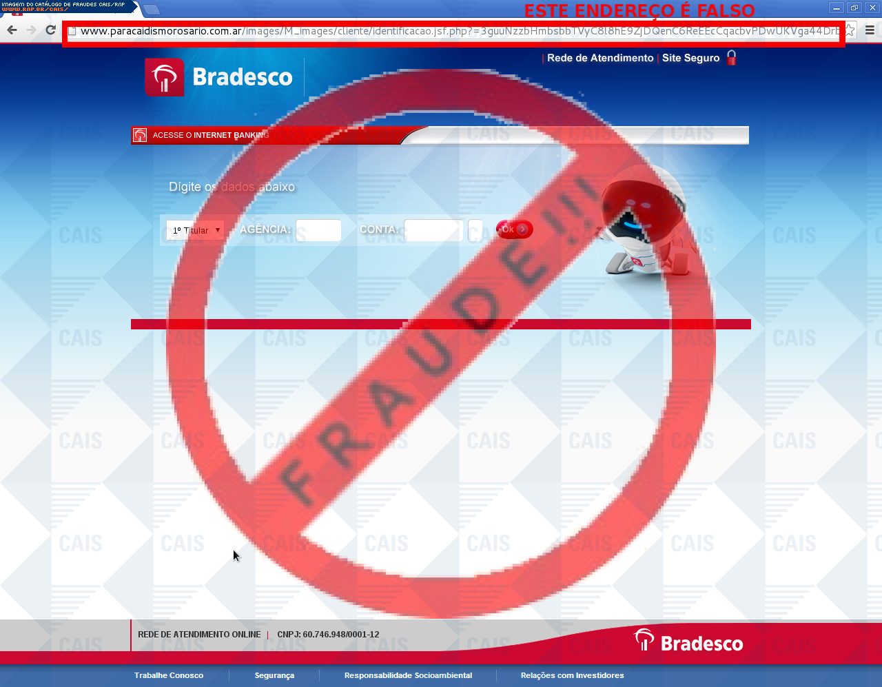 Esta página tem função informativa e educativa. Exibe uma coleção de imagens de phishing scam (fraudes eletrônicas) ou malware (código malicioso) veiculados por meio de spam (e-mail não-solicitado). Trata-se de conteúdo exemplificativo, não exaustivo, uma vez que não é possível contemplar todos os casos de fraudes existentes. Assim, caso você tenha conhecimento de um exemplar que não esteja aqui presente, isto não significa que não seja válido ou real. Inclusive incentivamos que você o envie para análise do CAIS para que, se for o caso, passe a integrar o nosso acervo.