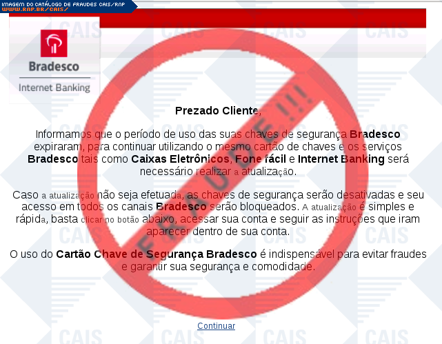 | comentário | A vítima recebe um email falso de um banco, informando que sua chave de segurança expirou. O link para reativá-la redireciona para um site de phishing. | |