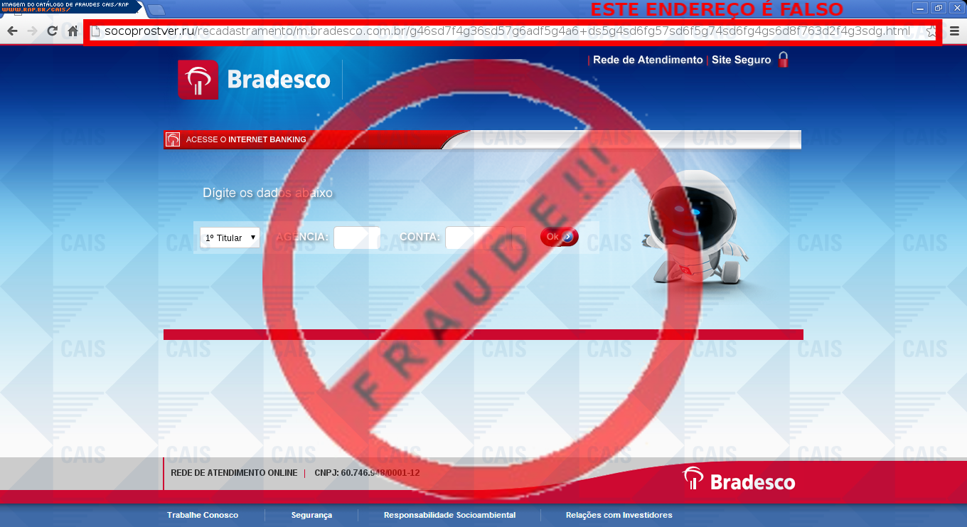 | comentário | A fraude consiste em um infoemail falso de um banco, a respeito de uma correções em dados cadastrais da vítima. O link para essa correção redireciona para um site de phishing. | |