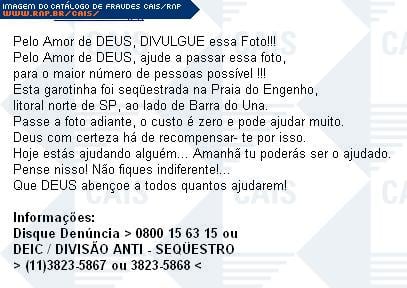 | comentário | Mais uma fraude que simula uma situação de desespero. Neste caso a mensagem trata do sequestro de uma garotinha ocorrido "na Praia do Engenho, litoral norte de SP, ao lado de Barra do Una." A foto que é oferecida é um arquivo malicioso, foto.scr, que foi... (leia mais) | |