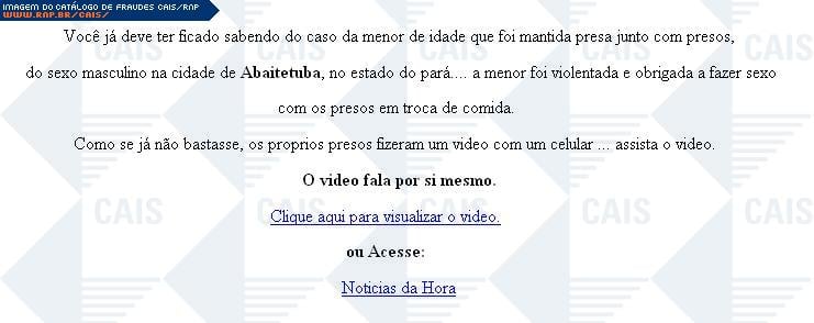 | comentário | Esta fraude aborda o caso de uma menor de idade que ficou presa com na cadeia masculina na cidade de Abaitetuba, no estado do Pará. Os dois links presentes na mensagem fazem download do arquivo malicioso, flash_player.exe, que foi identificado por antivirus... (leia mais) | |