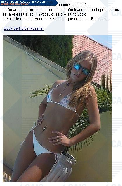| comentário | Nesta fraude temos a oferta de um book de fotos de uma suposta Rosane. O link presente na mensagem faz o download do arquivo Rosane.Book.flogao.com que foi identificado por antivirus como sendo Trojan-Spy.Win32.Banker.anv. | |