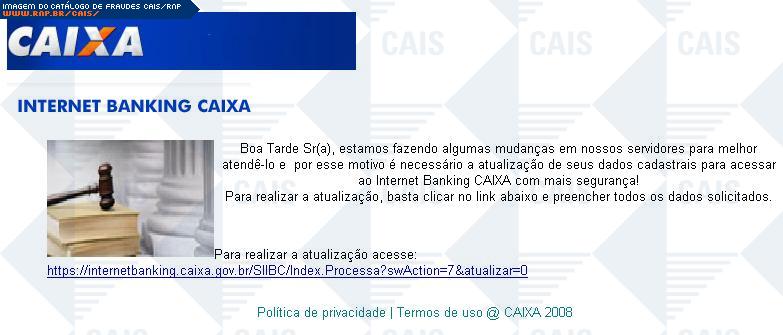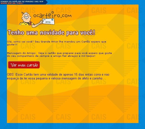Esta página tem função informativa e educativa. Exibe uma coleção de imagens de phishing scam (fraudes eletrônicas) ou malware (código malicioso) veiculados por meio de spam (e-mail não-solicitado). Trata-se de conteúdo exemplificativo, não exaustivo, uma vez que não é possível contemplar todos os casos de fraudes existentes. Assim, caso você tenha conhecimento de um exemplar que não esteja aqui presente, isto não significa que não seja válido ou real. Inclusive incentivamos que você o envie para análise do CAIS para que, se for o caso, passe a integrar o nosso acervo.