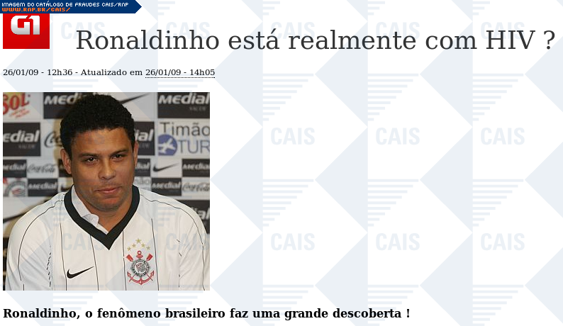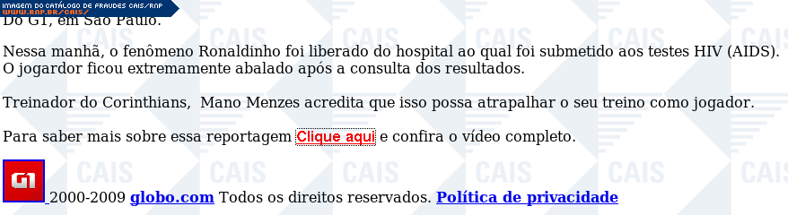 | comentário | Notícia supostamente enviada pela equipe de notícias da Globo.com, informando que o jogador de futebol Ronaldinho teria contraído o vírus HIV. A mensagem possui um link, que se encontrava quebrado no momento da análise, para um suposto vídeo. | |