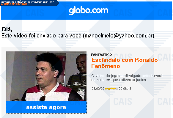 | comentário | E-mail que utiliza o nome da Globo.com para divulgar um suposto vídeo do Ronaldo "Fenômeno", divulgado pelo travesti na noite em que estiveram juntos. Ao clicar para assistir o vídeo, é feito o download do Trojan-Downloader.Win32.Delf.rre (Kaspersky). | |