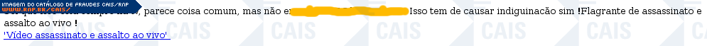 | comentário | Fraude que contém um link de um suposto vídeo de um flagrante de assassinato. O arquivo malicioso não foi encontrado no momento da análise. | |