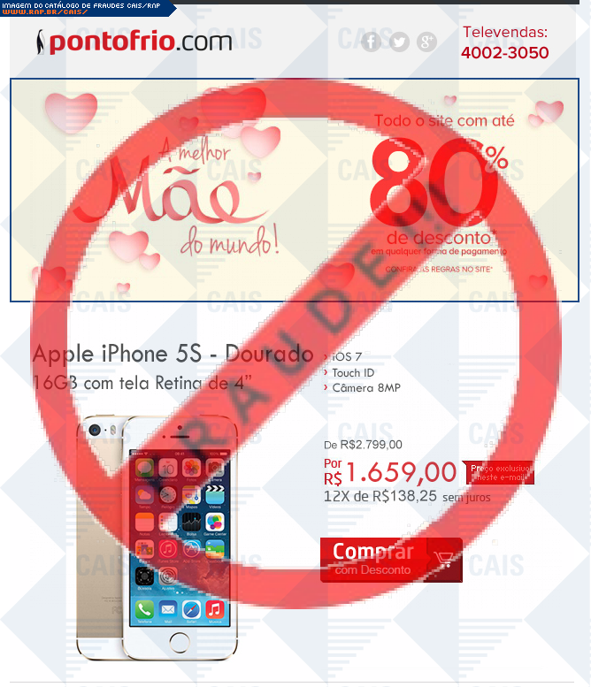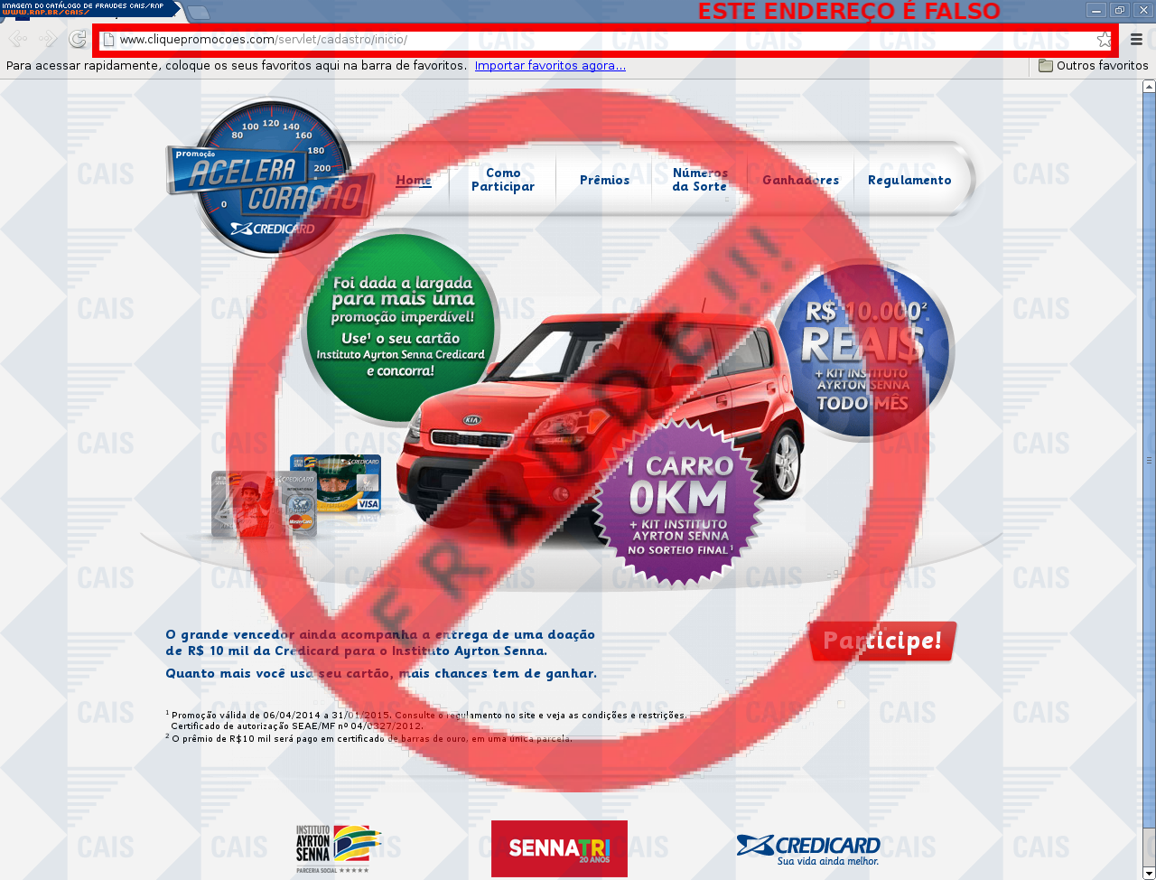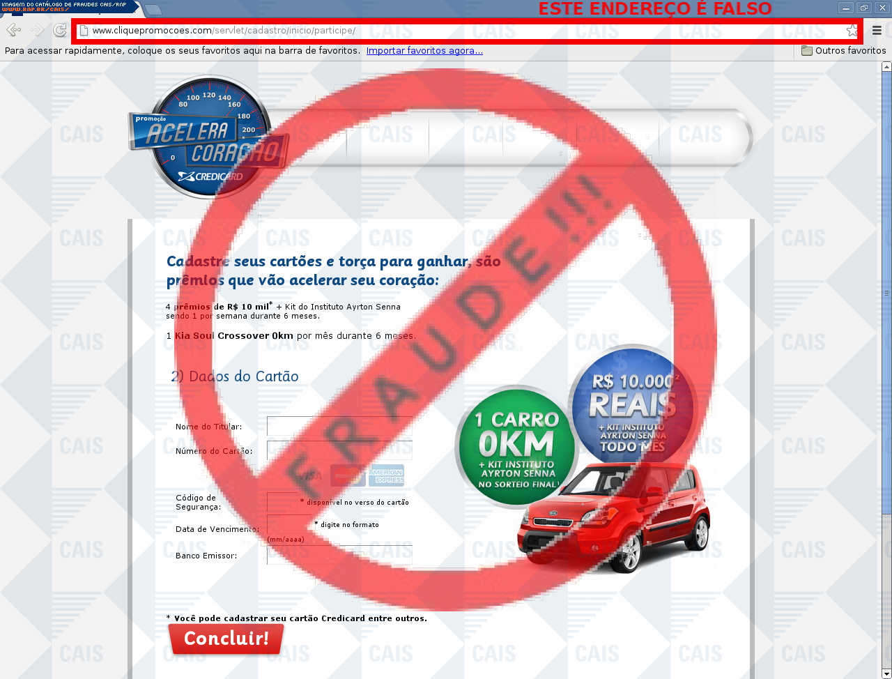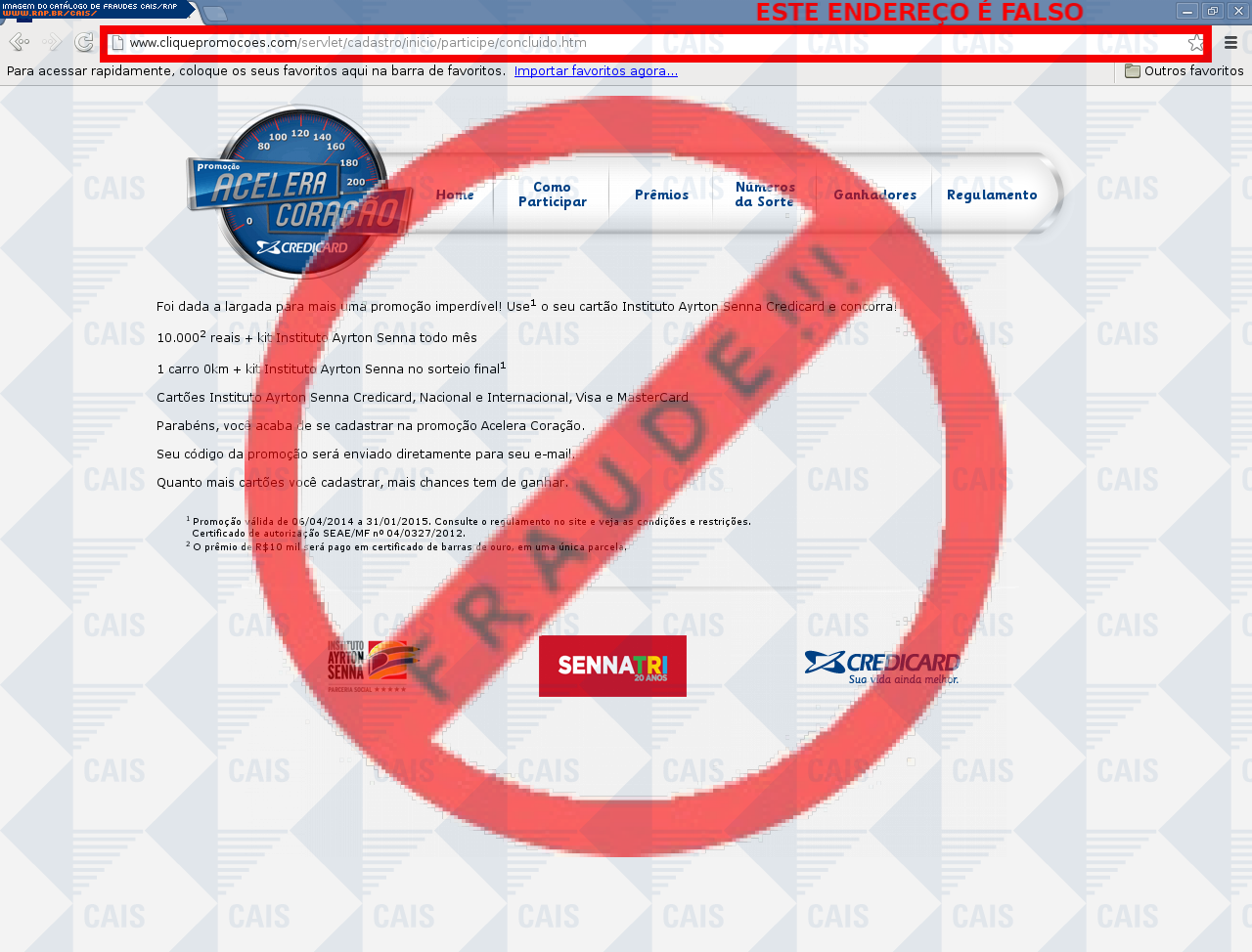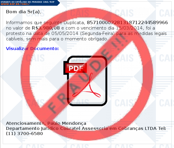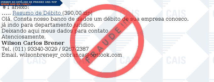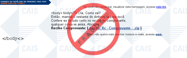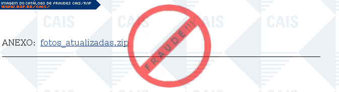 Esta página tem função informativa e educativa. Exibe uma coleção de imagens de phishing scam (fraudes eletrônicas) ou malware (código malicioso) veiculados por meio de spam (e-mail não-solicitado). Trata-se de conteúdo exemplificativo, não exaustivo, uma vez que não é possível contemplar todos os casos de fraudes existentes. Assim, caso você tenha conhecimento de um exemplar que não esteja aqui presente, isto não significa que não seja válido ou real. Inclusive incentivamos que você o envie para análise do CAIS para que, se for o caso, passe a integrar o nosso acervo.