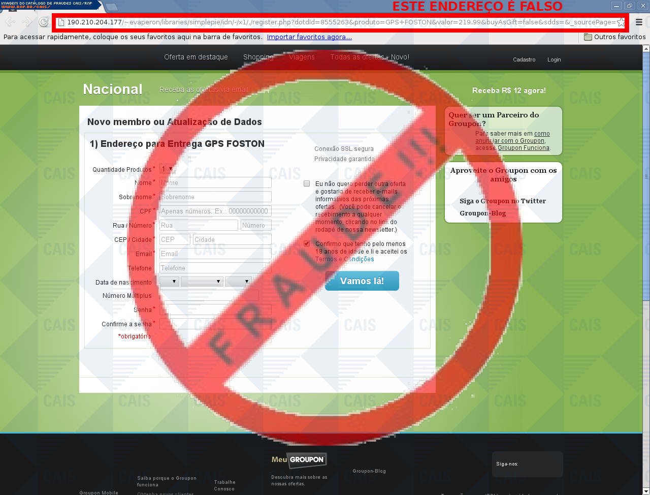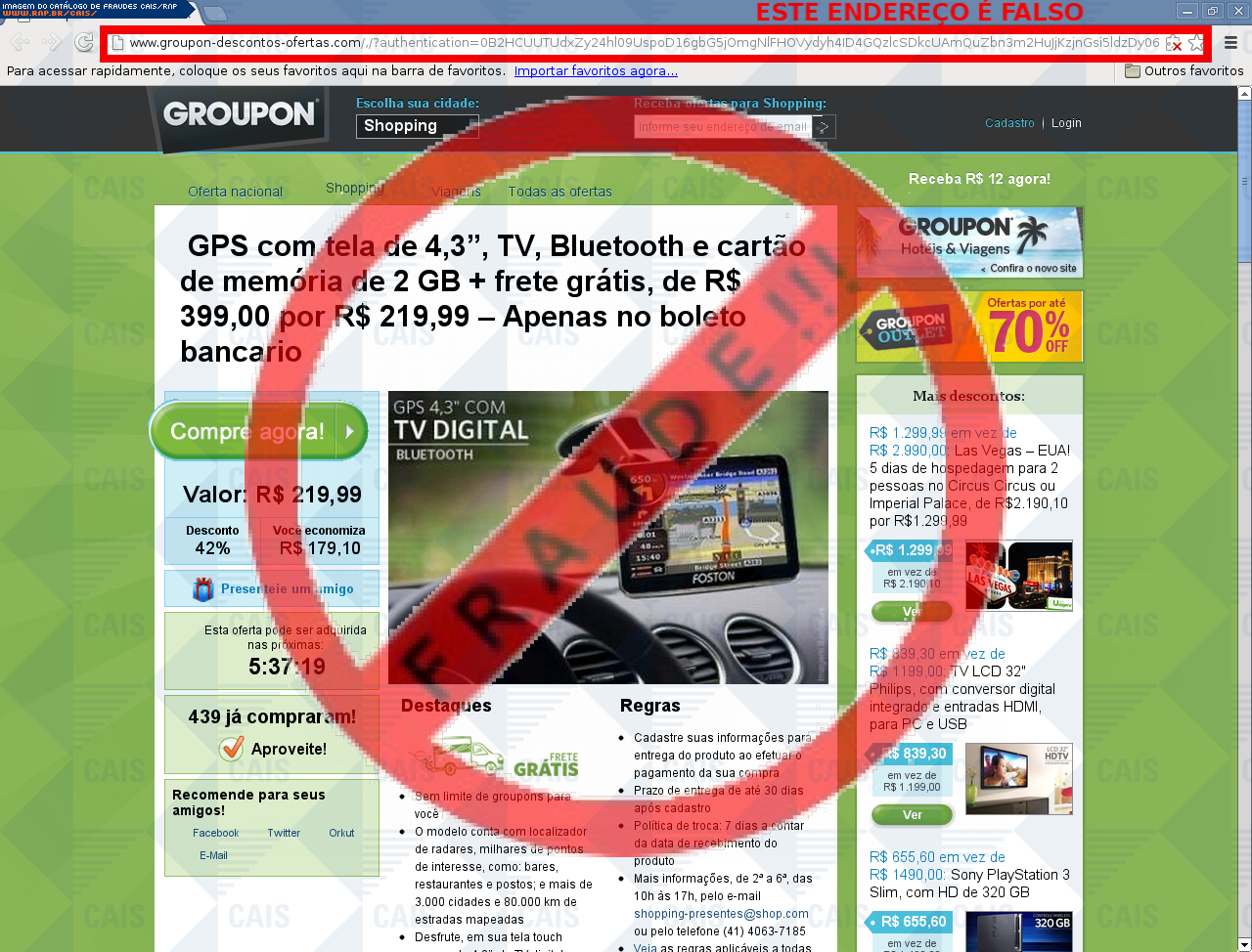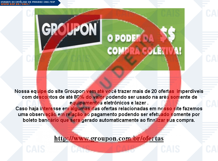 | comentário | A vítima recebe uma mensagem de um site de compras coletivas, contendo um link com algumas ofertas, mas ao clicar no link, a vítima é direcionada para uma página falsa, que no final da compra ainda gera um boleto falsificado para pagamento. | |