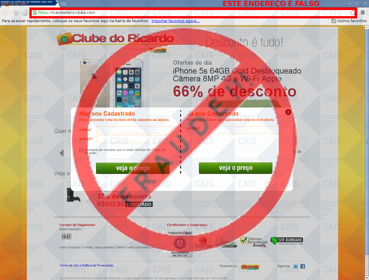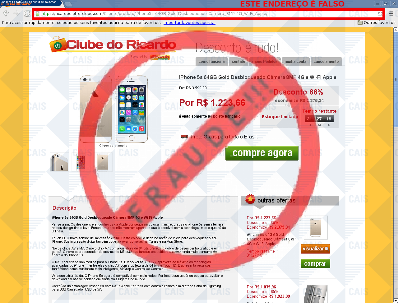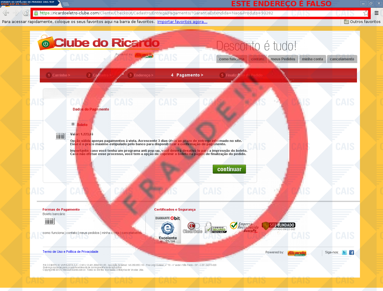 | comentário | A vítima recebe uma mensagem de um site de compras coletivas, contendo um link com algumas ofertas, mas ao clicar no link, a vítima é direcionada para uma página falsa, que no final da compra ainda gera um boleto falsificado para pagamento. | |