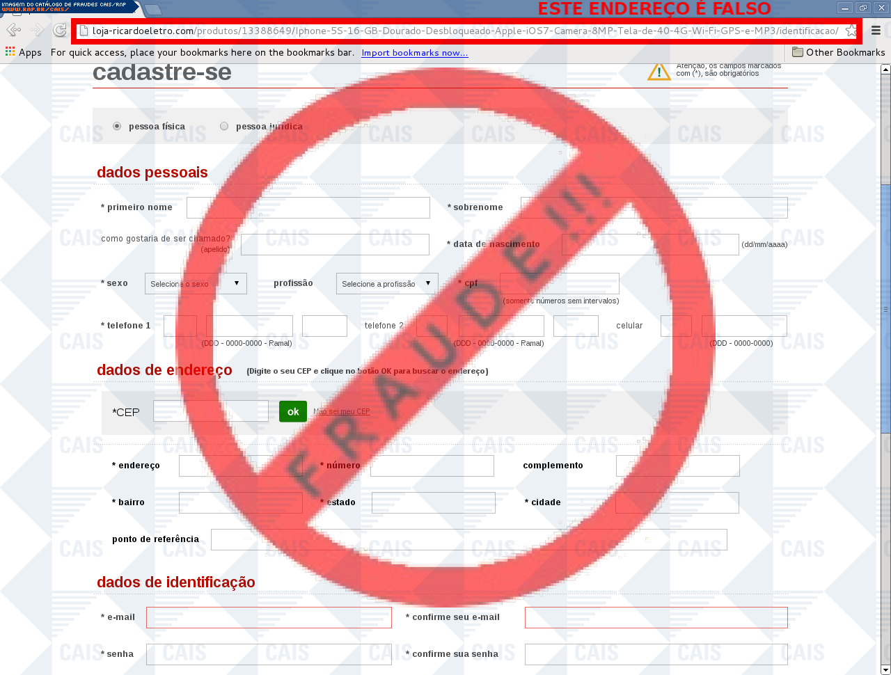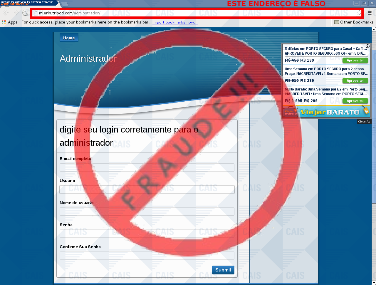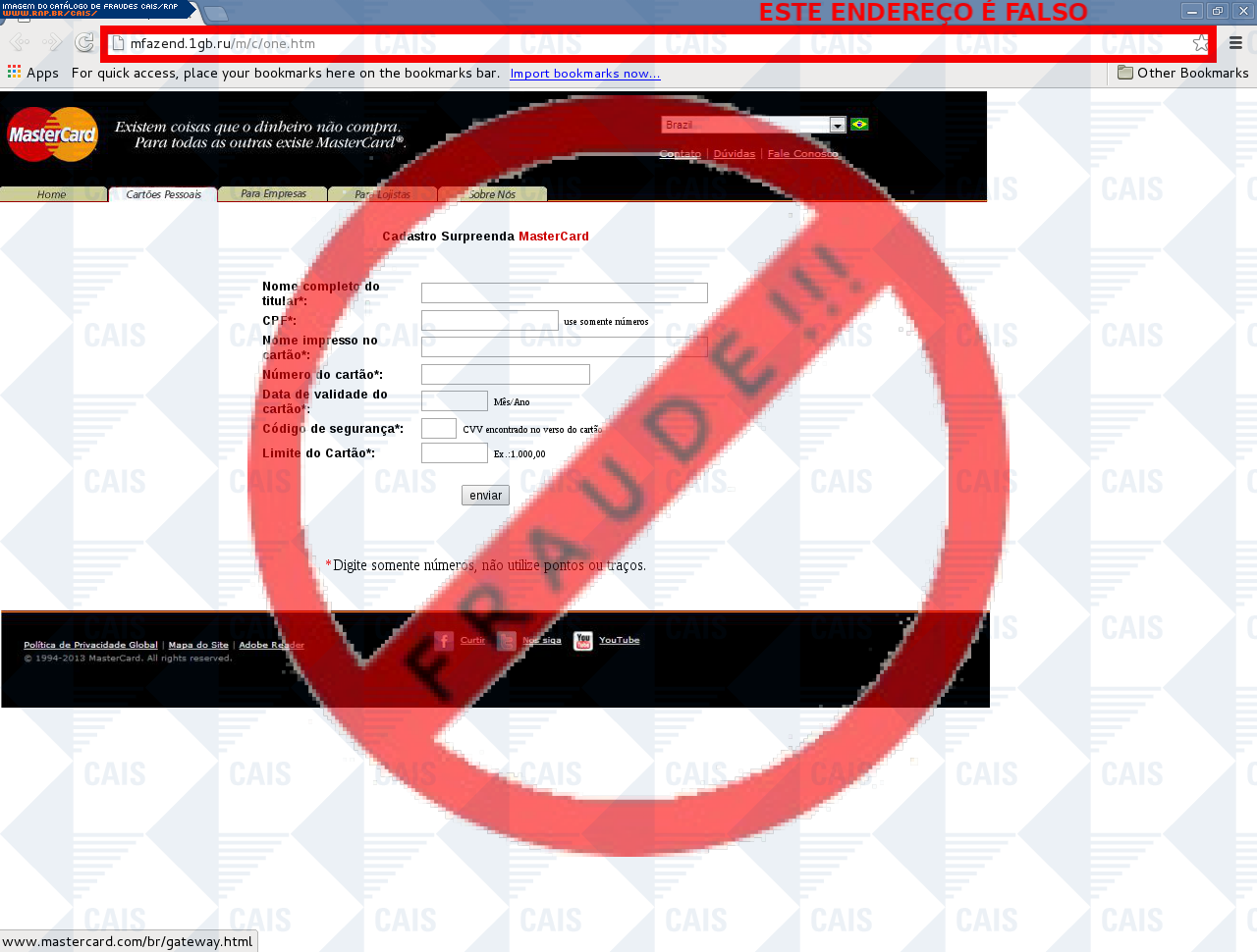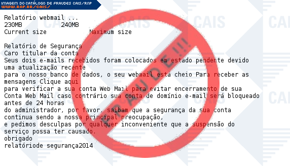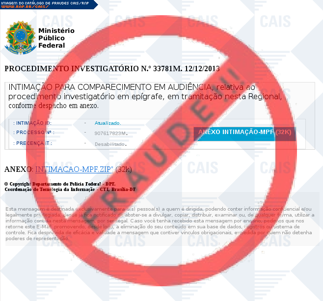 Esta página tem função informativa e educativa. Exibe uma coleção de imagens de phishing scam (fraudes eletrônicas) ou malware (código malicioso) veiculados por meio de spam (e-mail não-solicitado). Trata-se de conteúdo exemplificativo, não exaustivo, uma vez que não é possível contemplar todos os casos de fraudes existentes. Assim, caso você tenha conhecimento de um exemplar que não esteja aqui presente, isto não significa que não seja válido ou real. Inclusive incentivamos que você o envie para análise do CAIS para que, se for o caso, passe a integrar o nosso acervo.