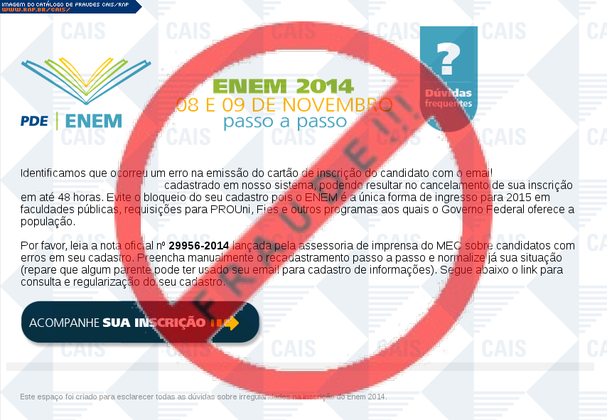 | comentário | A vítima recebe um e-mail informando sobre o cancelamento de sua inscrição no ENEM, estando disponível o link para o acompanhamento da inscrição. Porém o link gera um arquivo malicioso destinado a roubar informações do usuário com o nome de Trojan.Win32.Generic.ad.... (leia mais) | |