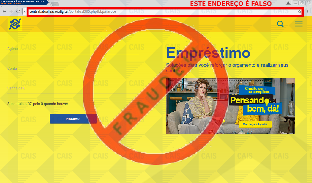 | comentário | O usuário recebe uma mensagem informando que o sistema do Banco do Brasil atualizou sendo necessário realizar uma atualização também na sua conta, no entanto a página é falsa destinada a roubar as informações bancárias do usuário. | |