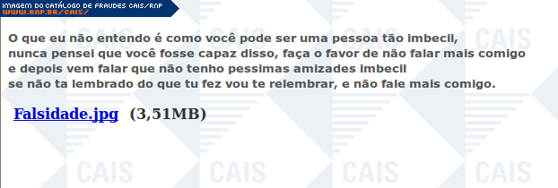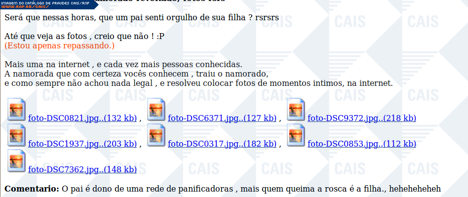 | comentário | Mensagem que contém links para supostas fotos íntimas postadas por um ex-namorado traído. Todos os links levam ao mesmo arquivo malicioso que foi identificado como Trojan.Generic.KDV.129868 (F-Secure). | |