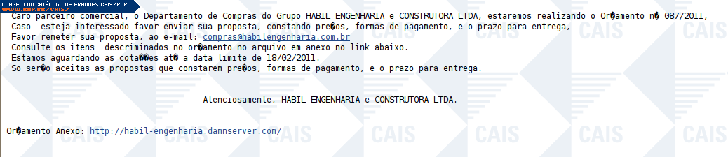 | comentário | Mensagem em que o grupo HABIL ENGENHARIA e CONSTRUTORA LTDA solicita a realização de um orçamento. A fraude contém um link para a suposta lista de produtos. O arquivo malicioso foi identificado como Gen:Trojan.Heur.PT.PqWaaGAiTajG (F-Secure). | |