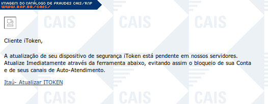 | comentário | Fraude que usa o nome do banco Itaú para solicitar a atualização do dispositivo de segurança iToken. A mensagem contém um link que leva a conteúdo malicioso indisponível no momento da análise. | |