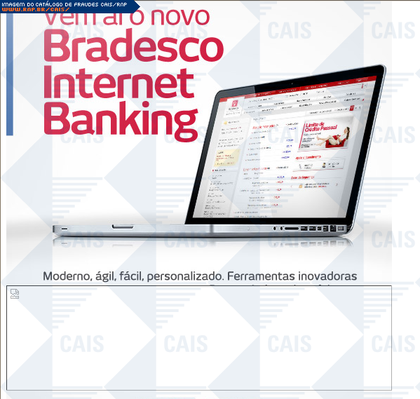 | comentário | Mensagem falsa do banco Bradesco divulgando uma nova versão de seu site. O link contido na mensagem leva a conteúdo malicioso que não estava disponível no momento da análise. | |