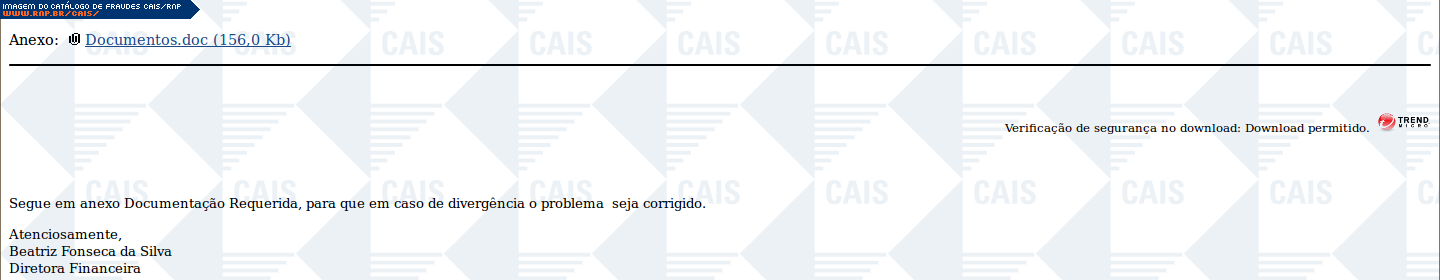| comentário | Mensagem contendo em anexo um suposto documento requerido pela vítima. O arquivo malicioso foi identificado como Gen:Trojan.Heur.fm0@sD442Dmif (BitDefender). | |