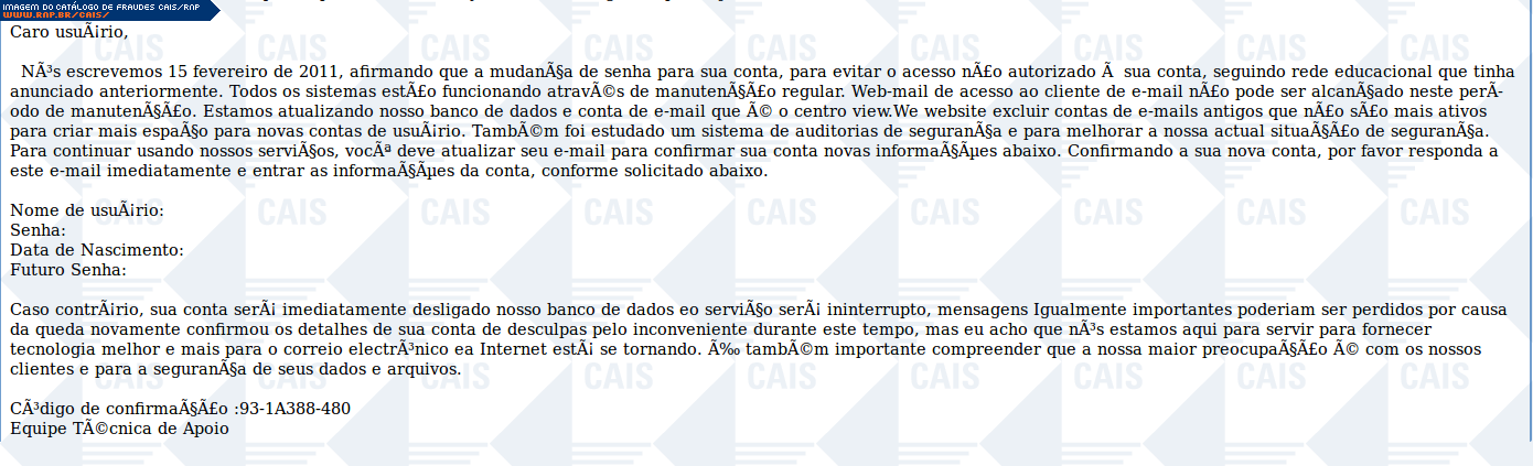 | comentário | Mais uma fraude que tenta aliciar o usuário a responder a mensagem informando seu email e senha. A fraude contém diversos erros de formatação. | |