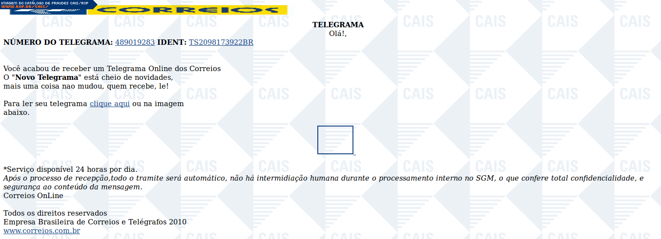 | comentário | Mensagem se passando por comunicado do Correios a respeito de um telegrama urgente. O link para a visualização do suposto telegrama leva a um software malicioso que foi identificado como Gen:Trojan.Heur.DP.EGW@amHPxDcG (F-Secure). | |