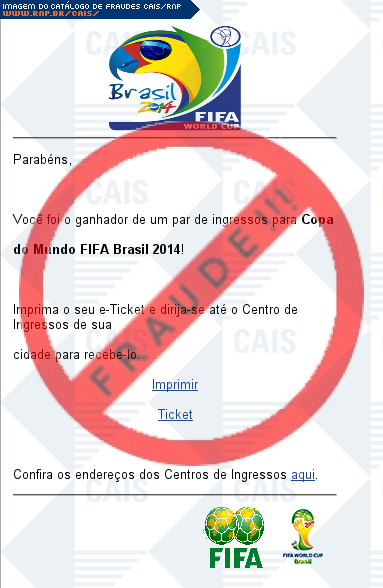 | comentário | A vítima recebe uma mensagem, informando que foi o ganhador de um par de ingressos para Copa do Mundo FIFA Brasil 2014, mas ao clicar no link para imprimir o Ticket, inicia-se o download de um malware. | |