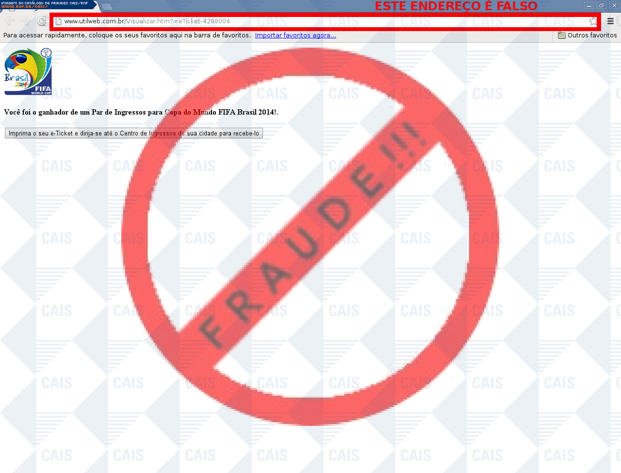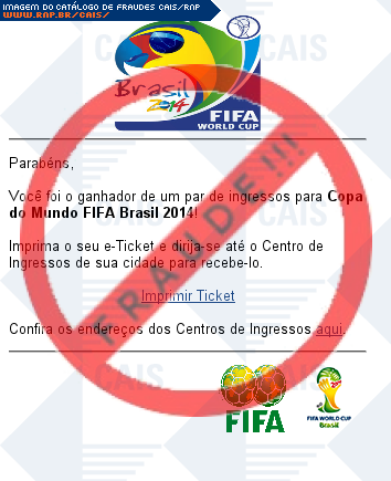 | comentário | A vítima recebe uma mensagem, informando que foi o ganhador de um par de ingressos para copa do mundo de 2014. Mas ao clicar no link para imprimir o seu e-Ticket, inicia-se o download de um malware. | |