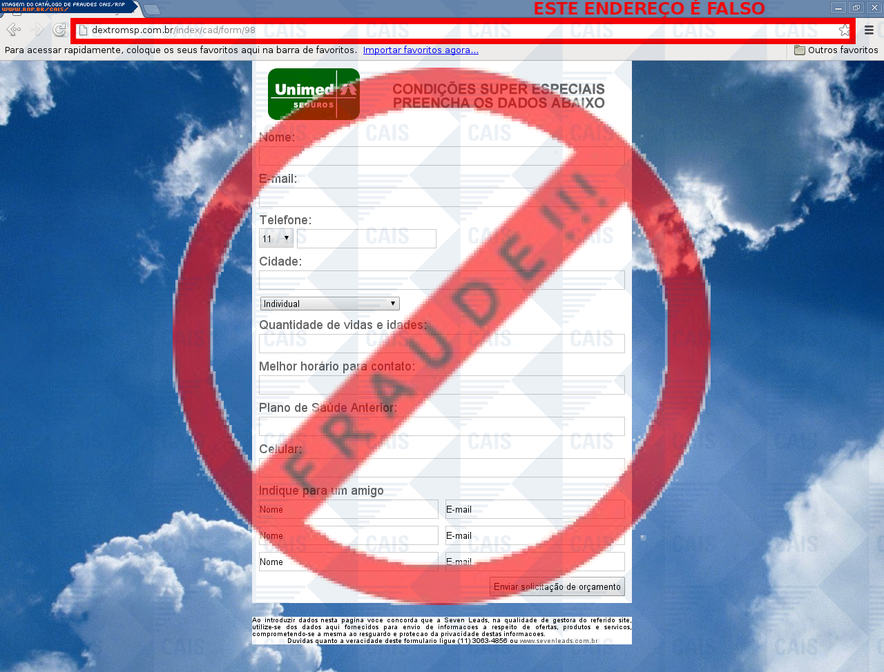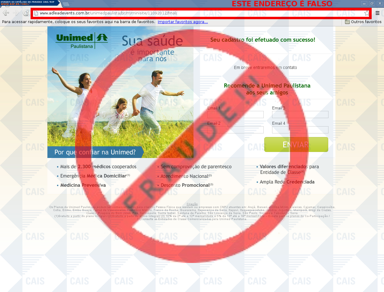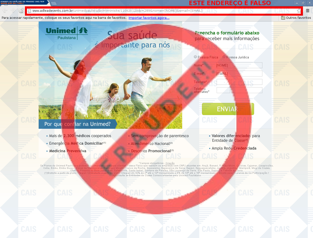 | comentário | A vítima recebe uma mensagem, informando sobre as vantagens do plano de saúde para sua família. Mas ao clicar no link para se informar melhor, a vítima é direcionada para uma página falsa. | |