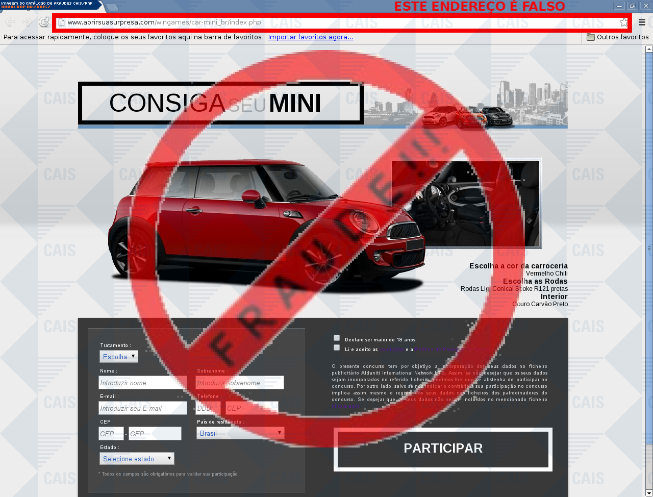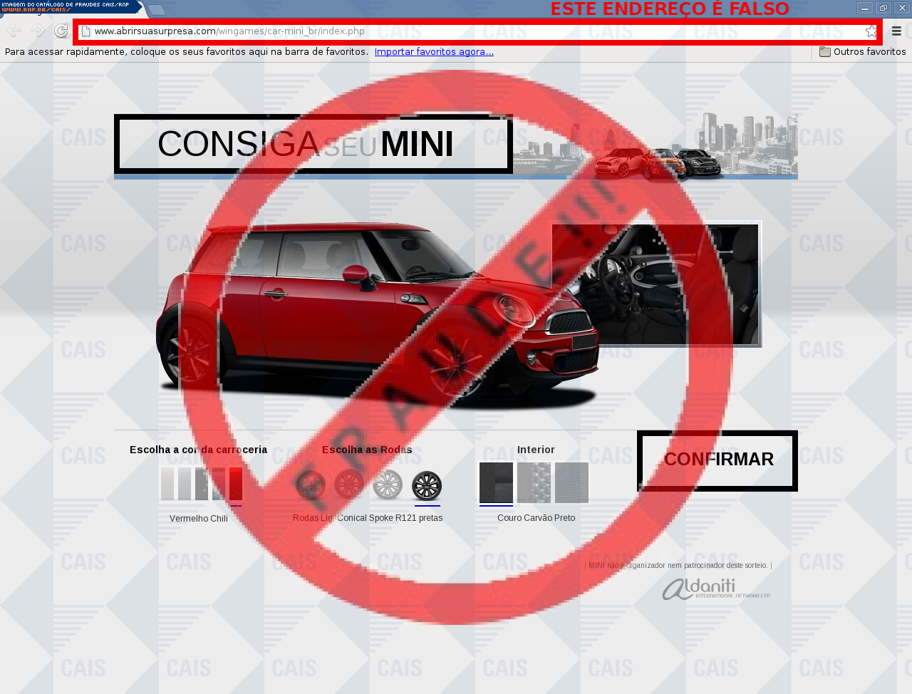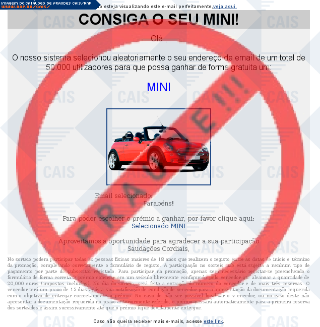 | comentário | A vítima recebe uma mensagem, informando que seu e-mail foi selecionado para ganhar de forma gratuita um carro (mini cooper). Mas ao clicar no link, a vítima é direcionada para uma página falsa. | |