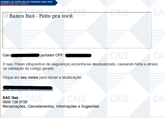 | comentário | Comunicado falso do banco Itaú solicitando que a vítima efetue a atualização do iToken. A mensagem contém o nome e cpf verdadeiro da vítima. O link para a suposta atualização leva a conteúdo malicioso que já havia sido removido no momento da análise. | |