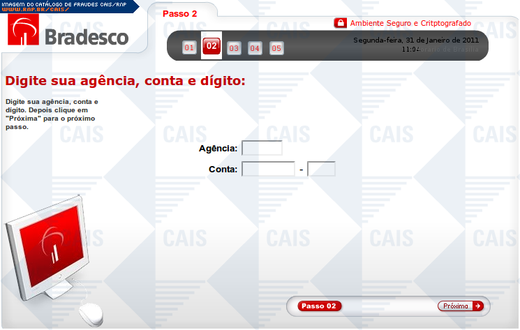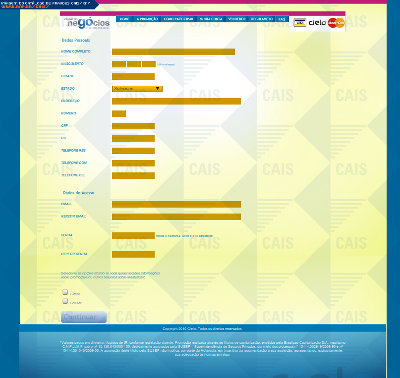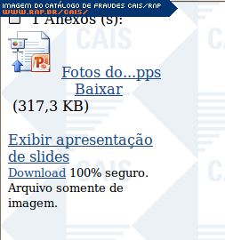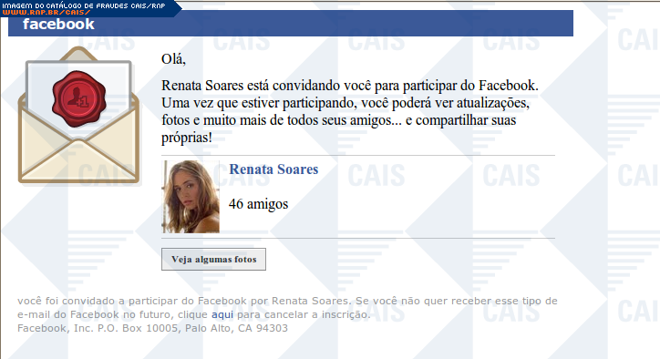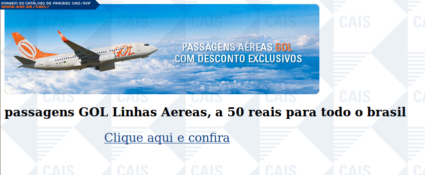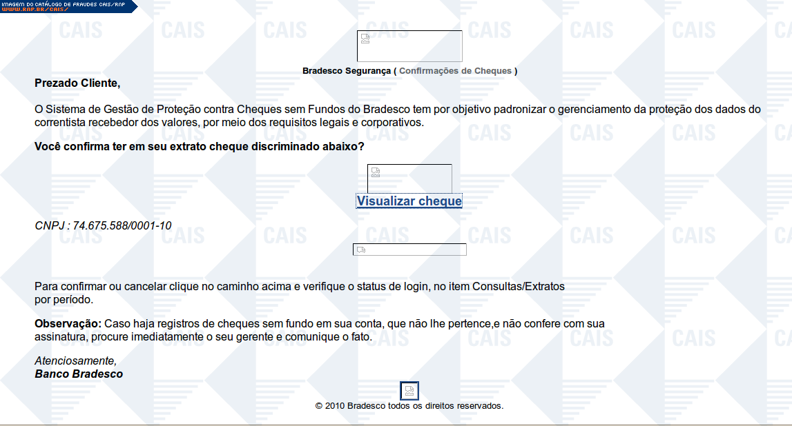 Esta página tem função informativa e educativa. Exibe uma coleção de imagens de phishing scam (fraudes eletrônicas) ou malware (código malicioso) veiculados por meio de spam (e-mail não-solicitado). Trata-se de conteúdo exemplificativo, não exaustivo, uma vez que não é possível contemplar todos os casos de fraudes existentes. Assim, caso você tenha conhecimento de um exemplar que não esteja aqui presente, isto não significa que não seja válido ou real. Inclusive incentivamos que você o envie para análise do CAIS para que, se for o caso, passe a integrar o nosso acervo.
