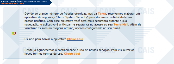 | comentário | Comunicado falso do Terra informando que devido ao grande número de fraudes ocorridas será necessária a instalação do aplicativo de segurança "Terra System Security". O link contido na mensagem leva a uma página para o download do suposto aplicativo. O arquivo... (leia mais) | |