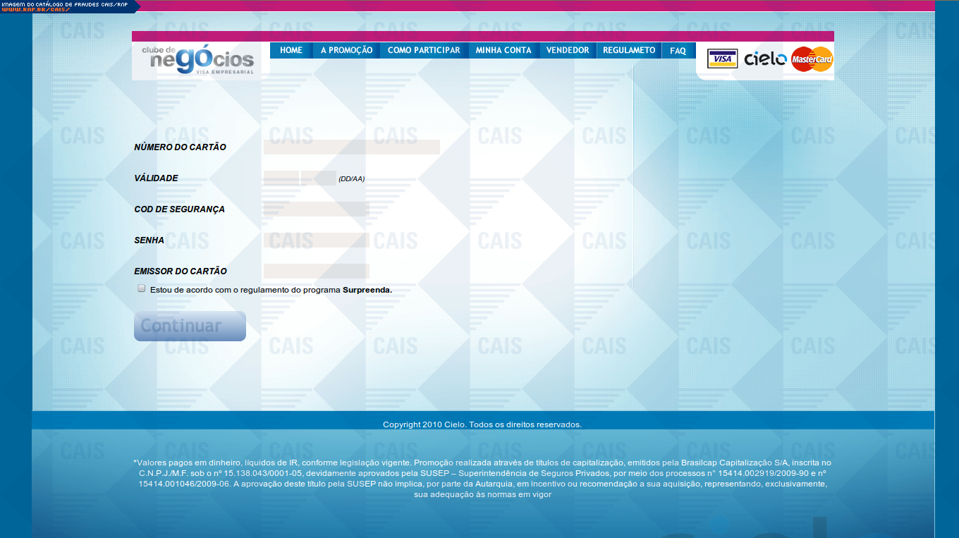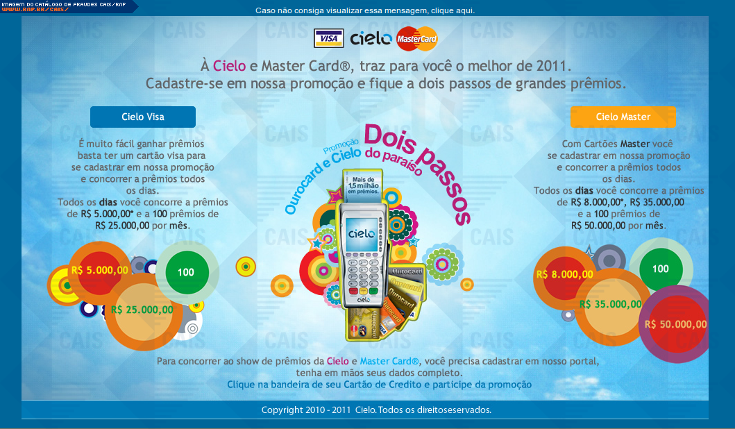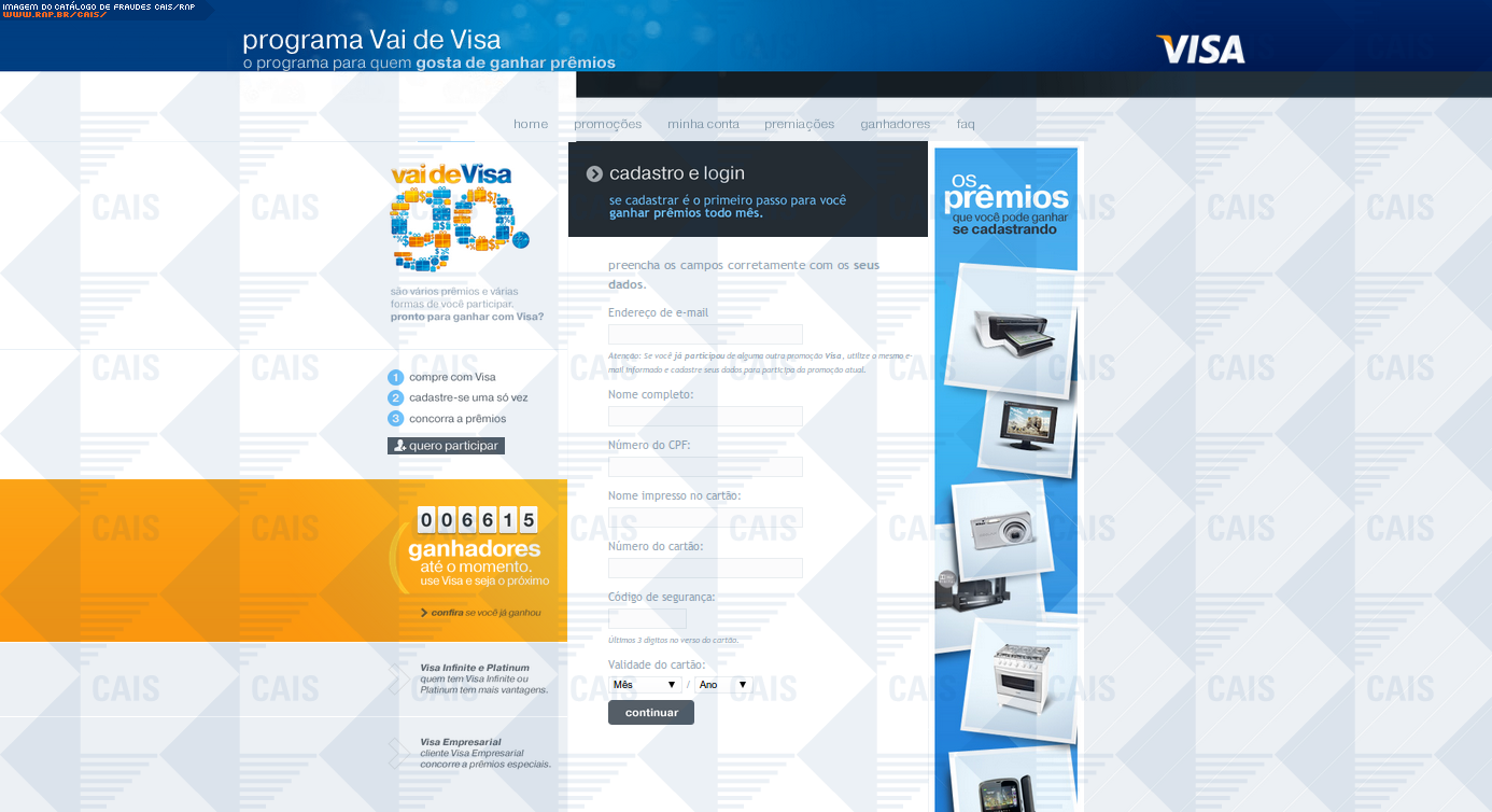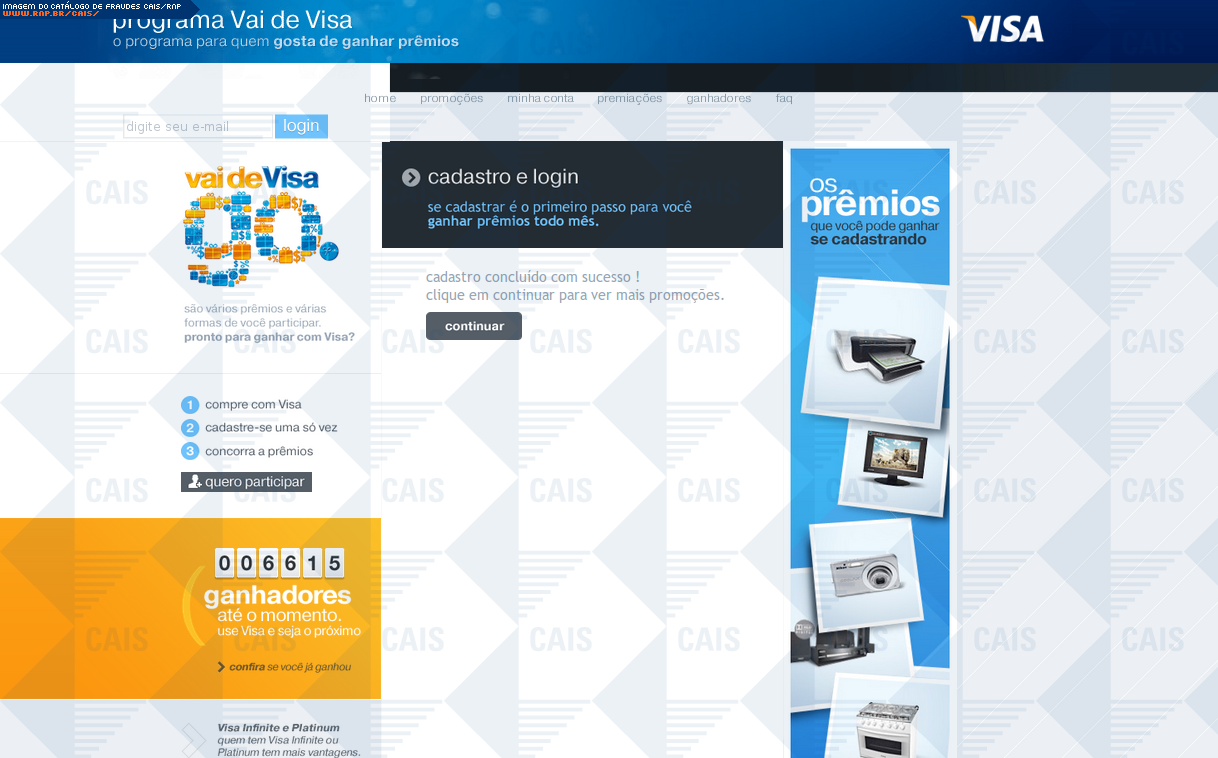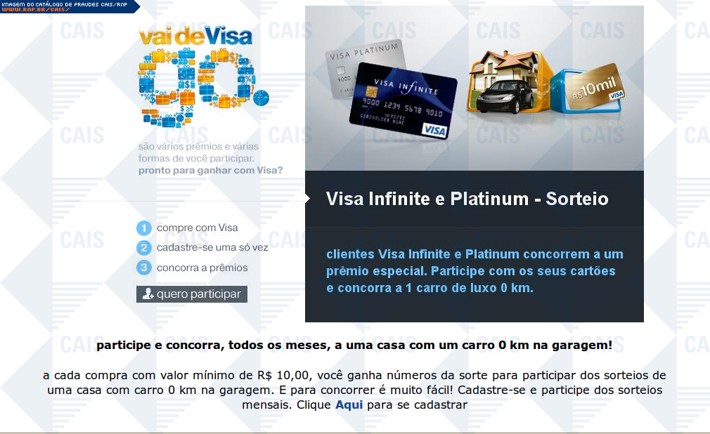 | comentário | Mais uma fraude anunciando a promoção "Vai de Visa". A fraude informa que clientes Visa Infinite e Platinum concorrem a um prêmio especial. O link para o cadastro na promoção leva a um site falso destinado a roubar os dados do cartão de crédito da vítima. | |