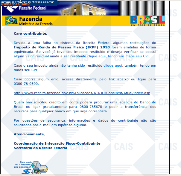 | comentário | Mensagem se passando pela Receita Federal para informar que devido a uma falha no sistema algumas restituições do Imposto de Renda de Pessoa Física (IRPF) 2010 foram emitidas de forma equivocada. O email contém um link onde o recebedor da mensagem deveria... (leia mais) | |