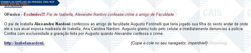 | comentário | Fraude que foi postada como scrap no orkut informando sobre a suposta gravação feita em celular da confissão de Alexandre Nardoni ao amigo de faculdade Augusto Fontinelli sobre o assassinato da menina Isabella. O link presente na mensagem faz download do... (leia mais) | |