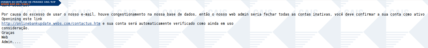 | comentário | A mensagem pede que a vítima reative seu email através de um link. O conteúdo malicioso não estava disponível no momento da análise. | |