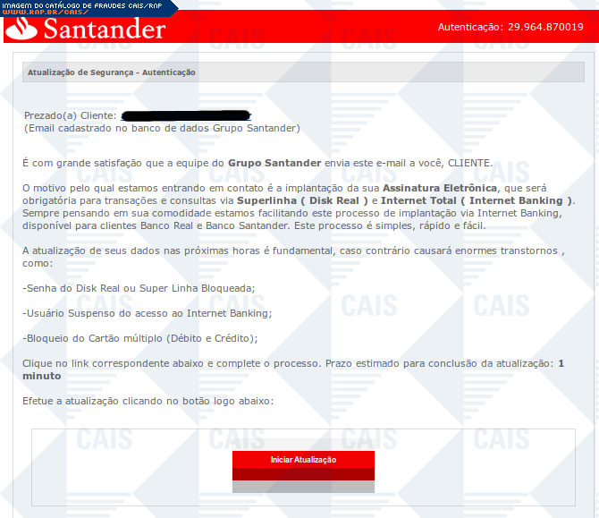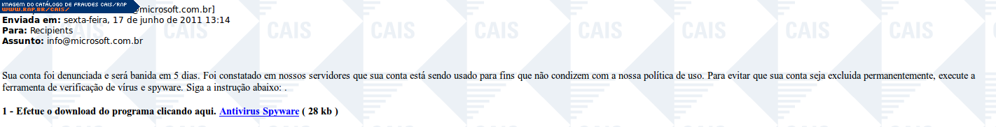 Esta página tem função informativa e educativa. Exibe uma coleção de imagens de phishing scam (fraudes eletrônicas) ou malware (código malicioso) veiculados por meio de spam (e-mail não-solicitado). Trata-se de conteúdo exemplificativo, não exaustivo, uma vez que não é possível contemplar todos os casos de fraudes existentes. Assim, caso você tenha conhecimento de um exemplar que não esteja aqui presente, isto não significa que não seja válido ou real. Inclusive incentivamos que você o envie para análise do CAIS para que, se for o caso, passe a integrar o nosso acervo.