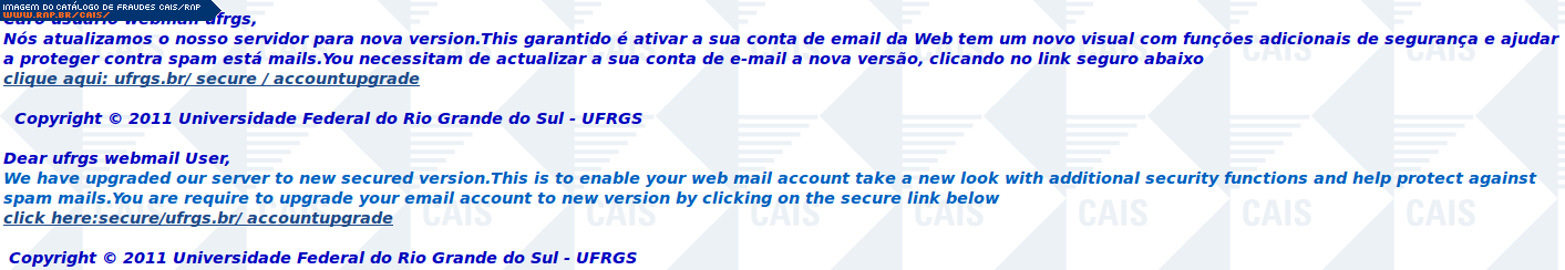 | comentário | Mensagem que avisa à vítima que a conta dela do webmail da UFRGS precisa ser atualizada pois o suposto servidor de webmail sofreu uma atualização. O link disponível para a atualização de senha direciona para um formulário hospedado em um conhecido servidor... (leia mais) | |