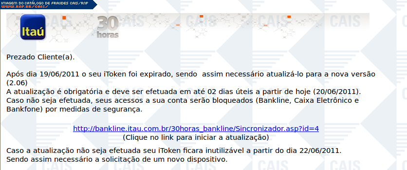 | comentário | Comunicado falso do banco Itaú notificando que o iToken da vítima expirou. O link para a atualização do iToken leva a um software malicioso que foi identificado como Gen:Variant.Kazy.28824 (BitDefender). | |
