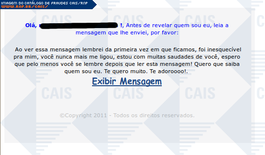 | comentário | Fraude contendo um link para uma suposta mensagem virtual que teria sido enviada por um amigo da vítima. O link leva a um software malicioso que foi identificado como Trojan-Dropper.Agent (Ikarus). | |