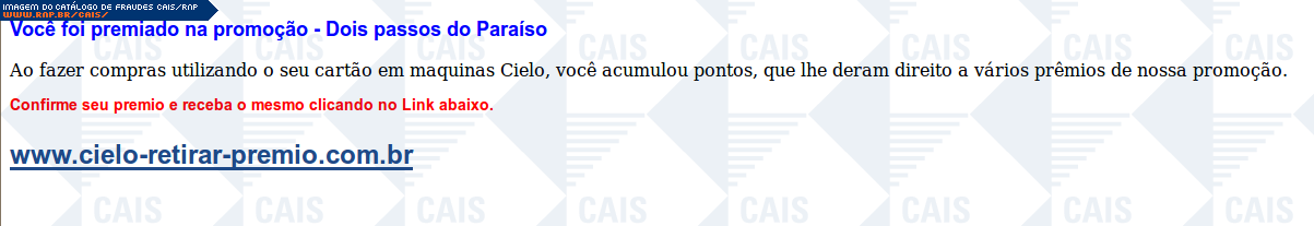 | comentário | A mensagem, em nome da Cielo, informa que a vítima foi premiada na promoção Dois Passos. O link para que a vítima receba seu suposto prêmio leva a conteúdo malicioso que não estava disponível no momento da análise. | |