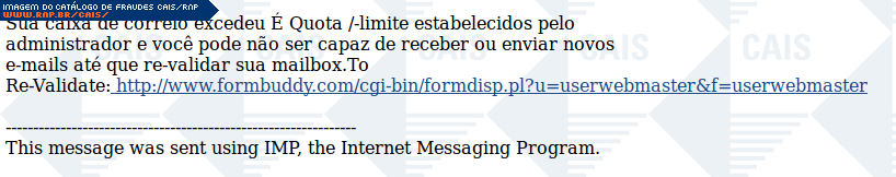 | comentário | A mensagem informa que a cota do email da vítima foi excedida . A fraude contém um link para que a vítima revalide sua conta. O link leva a uma página destinada a roubar a senha da vítima. | |