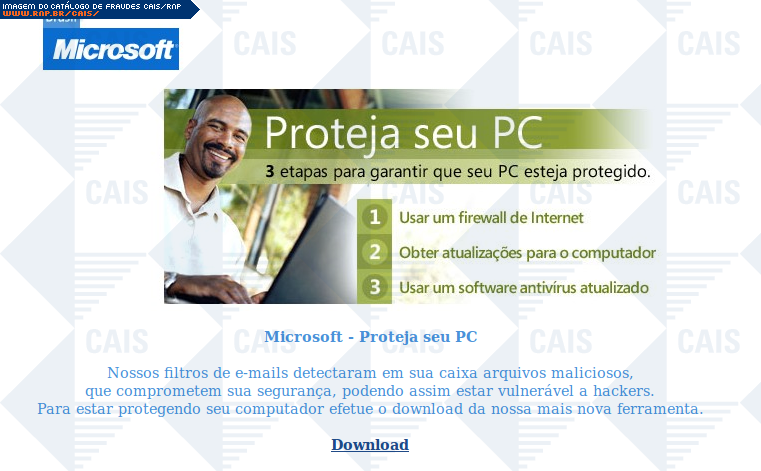 | comentário | A mensagem, em nome da Microsoft, contém um link para o download de uma suposta ferramenta de segurança. O conteúdo malicioso não estava disponível no momento da análise. | |